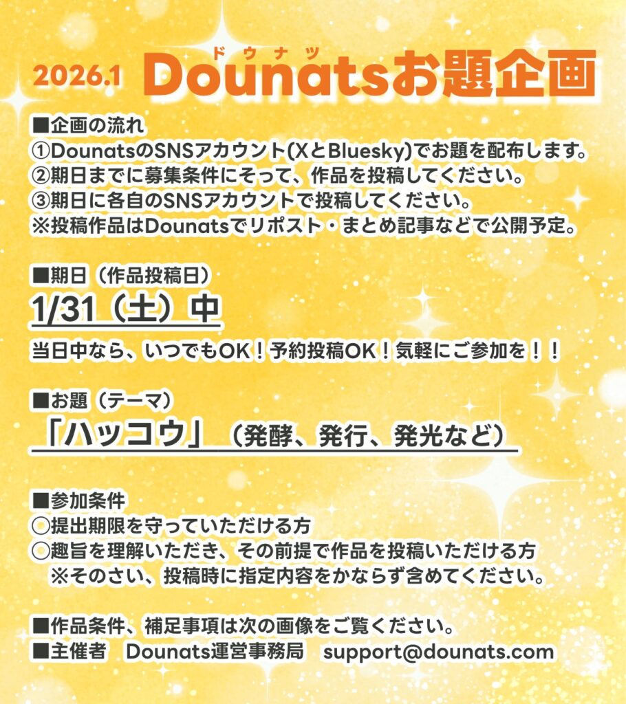お題企画は、主催者が配布する「お題」にそって、期日までに作品を投稿していただく企画。2026年1月のお題は「ハッコウ」です。詳細は公式X(旧Twitter)、Blueskyをご確認ください。